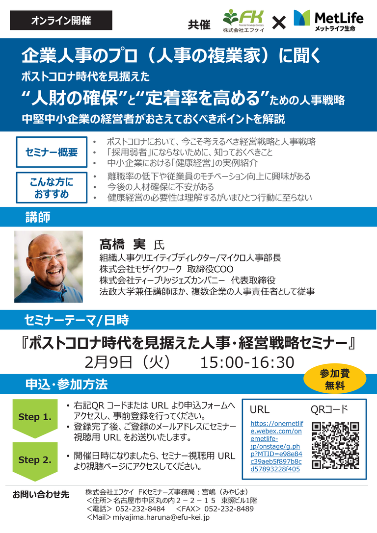 当セミナーは、企業人事のプロ(人事の複業家)をお招きし、ポストコロナ時代を見据えた“人財の確保”と“定着率を高める”